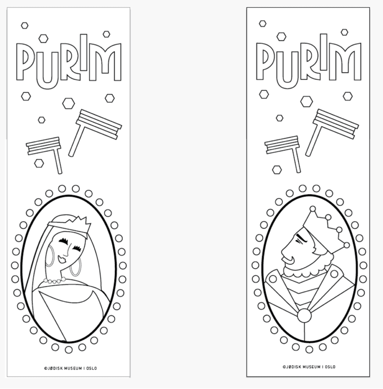 Her kan du laste ned arbeidsark for å lage bokmerker og medaljonger med dronning Ester og kong Ahashverus, som kan fargelegges til purim.
