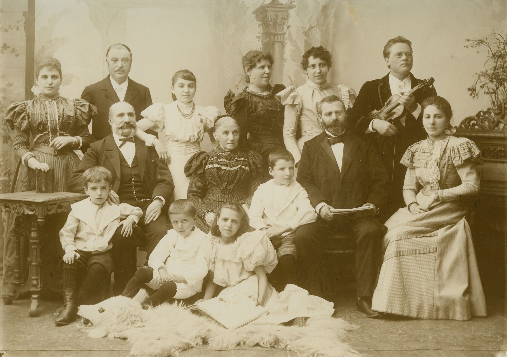 Gruppebilde av familiene De Lemos, Nathan og Bjerke, Kristiania 1897. Mathilde Berendsen Nathan står som nummer tre fra høyre i øverste rekke. (Fotografiet er en gave til museet fra Carl Sigvart Arntzen). detekst