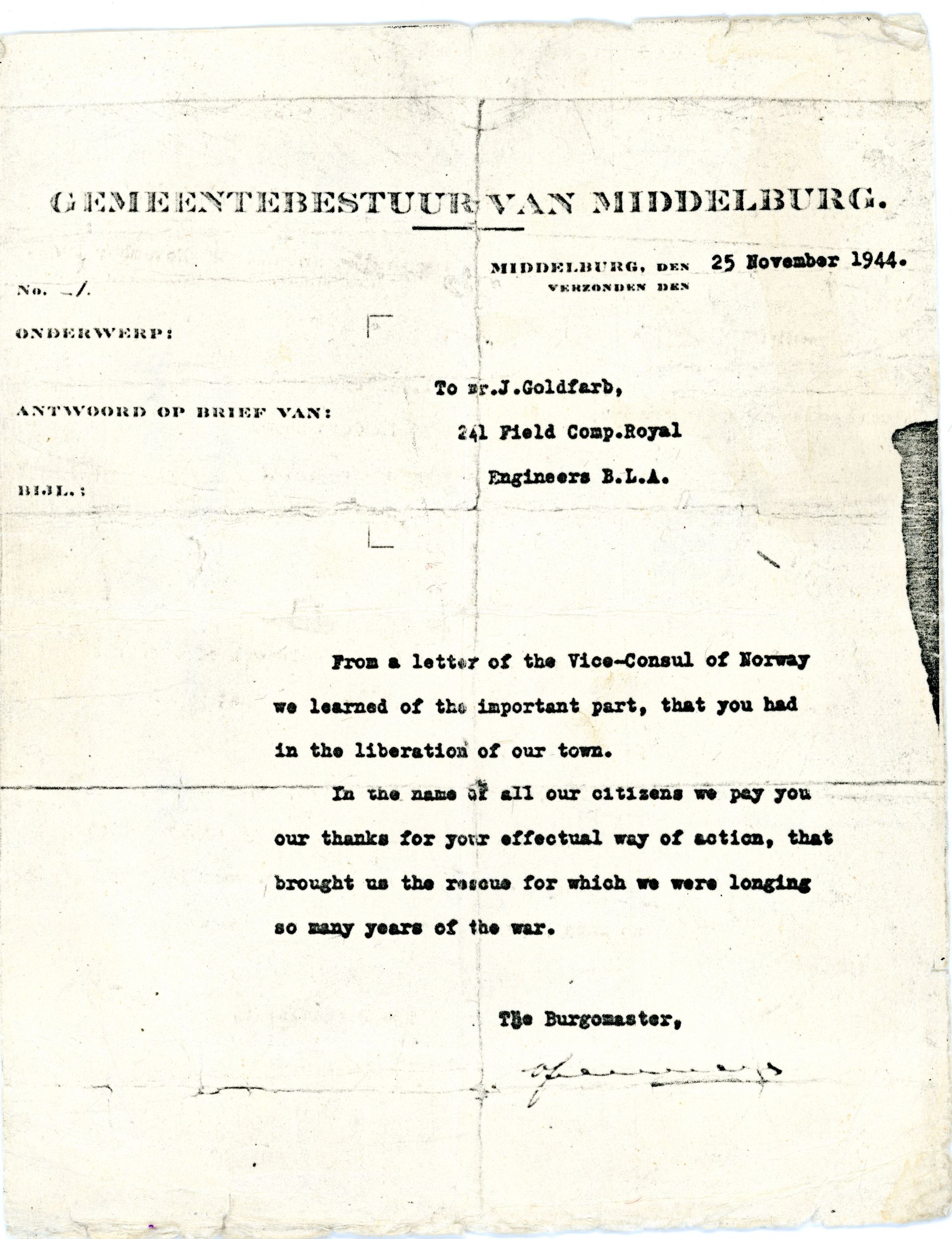 I november 1944 fikk løytnant Goldfarb brev fra borgermesteren i Middelburg med takk for innsatsen for byens frigjøring. (Brevet er utlånt museet av David Pagrotsky, Gøteborg)
